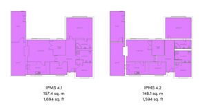 IPMS 4.1 includes all internal walls and columns within user-defined extents, whereas IPMS 4.2 excludes these. As these extents are both defined by the user, it is important to ensure that a plan is prepared alongside the area quoted, so information is clear to all users and can be verified in future if needed.